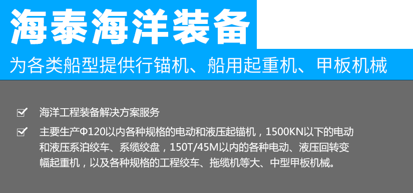 江蘇海泰海洋裝備有限公司位于素稱“銀杏之鄉(xiāng)”的泰興市,2018年投資建設,至今已經(jīng)成為產(chǎn)品研發(fā)、生產(chǎn)制造,調(diào)試服務為一體的設備配套企業(yè)。公司從事海洋裝備(設備)及配件的制造、設計、安裝,維修;船用錨機、絞車、起重機、舾裝件、電氣設備、環(huán)保設備設計、制造。公司成立以來,就與中國船舶工業(yè)集團公司第701所、702所、704所、708所、上海船舶研究設計院等多家船舶科研院所建立了技術(shù)合作關系,產(chǎn)品應用于......